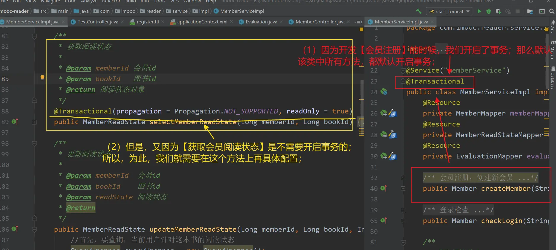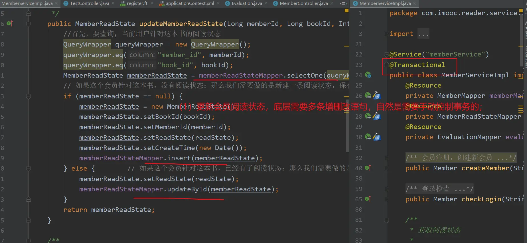 ●【SSM开发书评网24:更新会员阅读状态;】;更新会员阅读状态功能,底层需要多条增删改语句,自然需要开启手动控制事务;