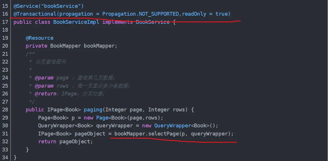 ●【SSM开发书评网12:图书列表分页及查询二:图书分页查询(1);】:图书分页查询功能,因为其底层只需要执行一条SQL,而且其还是查询,所以可以不手动控制事务;