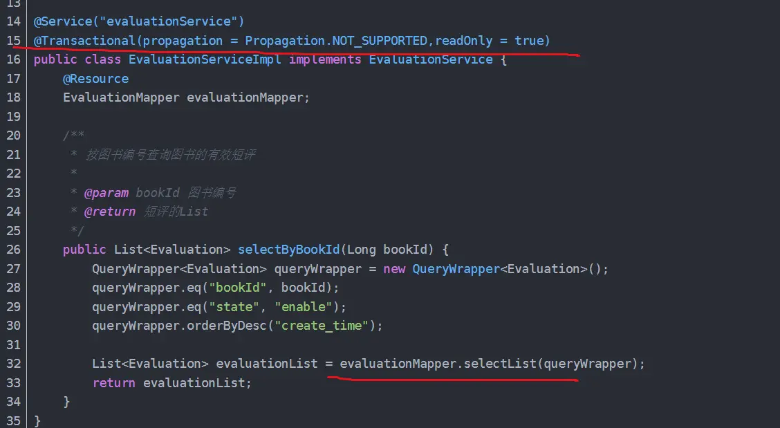 ●【SSM开发书评网18:图书详情页开发二:显示评论列表;】:显示评论列表功能,因为其底层只需要执行一条SQL,而且其还是查询,所以可以不手动控制事务;