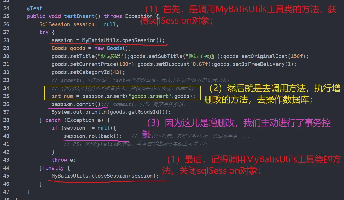 PS:一个仍然未解决的问题:可以看到,我们并没有写【conn.setAutoCommit(false);】这种类似的语句来开启手动管理事务;这是为什么?目前的一个可以勉强糊弄自己的解释:主要原因就是在连接池中取出的连接,都会将调用 connection.setAutoCommit(false)方法,来关闭自动事务控制,这样我们就必须使用 sqlSession.commit()方法,相当于使用了 JDBC 中的 connection.commit()方法实现事务提交。这句话参考自【Mybatis 的事务控制】;