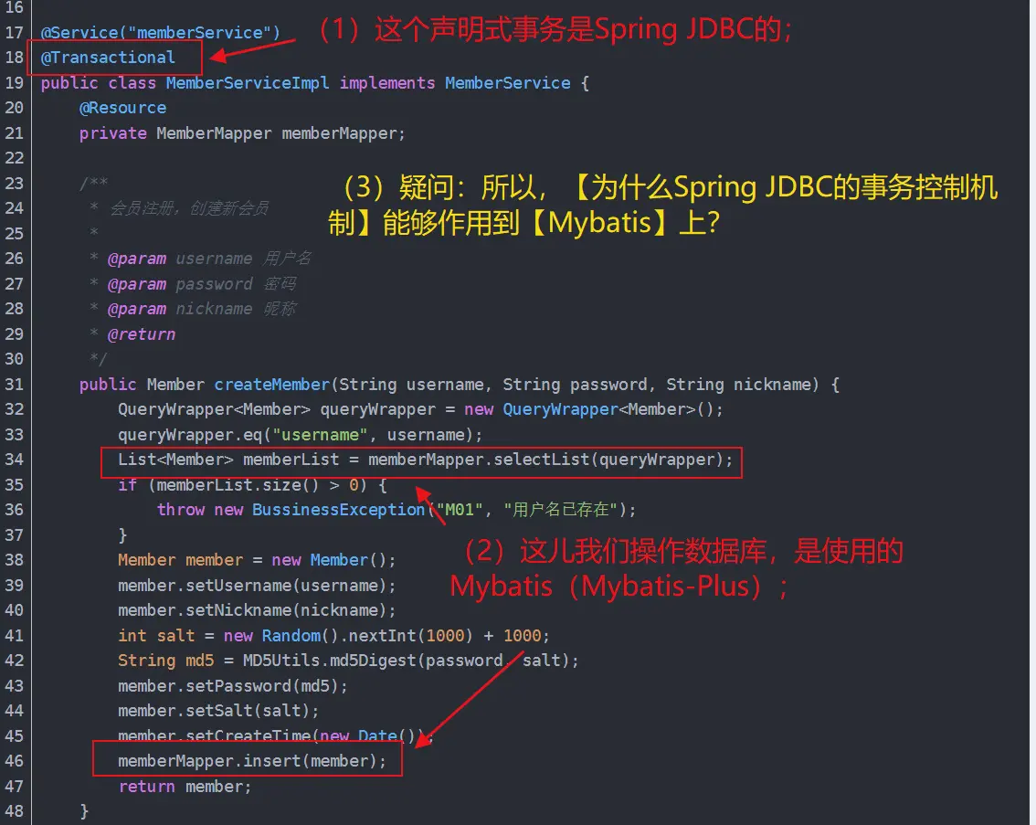 疑问: 所以,这儿就有了一个疑问:【Spring JDBC的声明式事务】是Spring JDBC的,那么【Spring JDBC的声明式事务】为什么能够对【我们使用Mybatis操作数据库】起作用;
