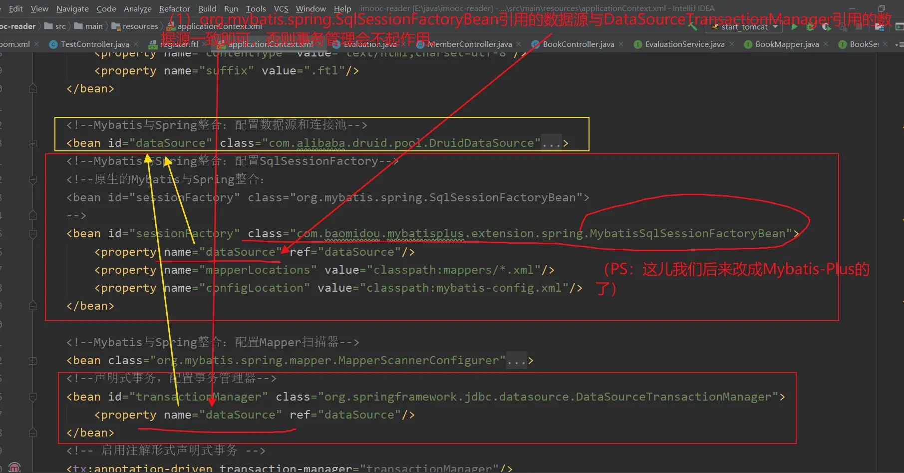 ● 首先,Spring+Mybatis项目,我们需要配置:可以参考【SSM开发书评网5:项目准备与SSM整合三:Spring与Mybatis整合;】;