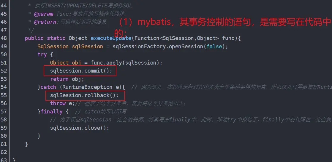 ● Mybatis本身的事务控制,不太好: 使用Mybatis去管理事务的时候,我们需要把事务控制的语句写在业务代码中;也就是说,我们需要在业务代码中,通过调用api来实现事务控制;(PS:这和Spring JDBC的编程式事务挺像的,都是需要在在业务代码中,通过调用api来管理事务;而,这种在需要事务控制的地方,就编写事务控制语句的方式,是不太好的:开发麻烦、不简明,容易出错;很容易想到,Spring JDBC有两种事务控制机制:编程式事务和声明式事务;这也是为什么我们选用声明式事务,而没有选用编程事务的原因;)