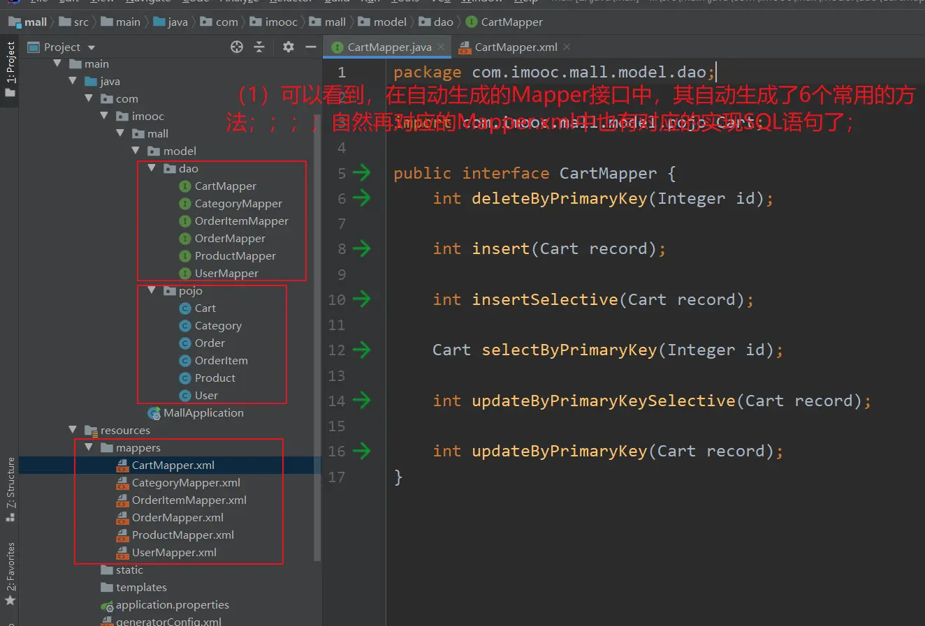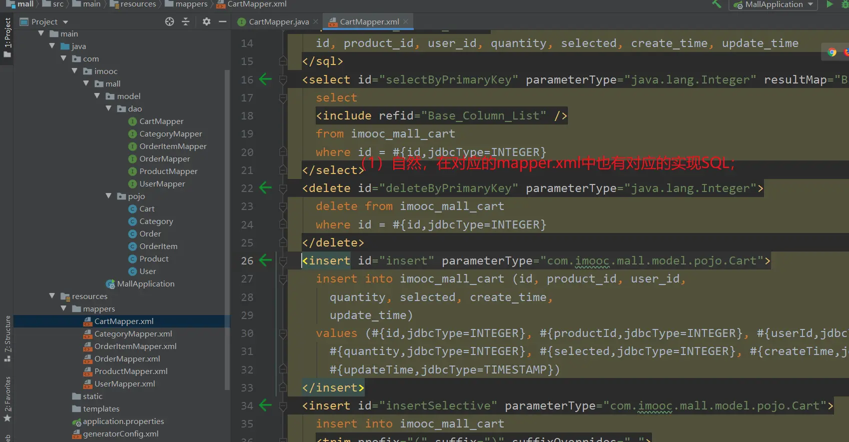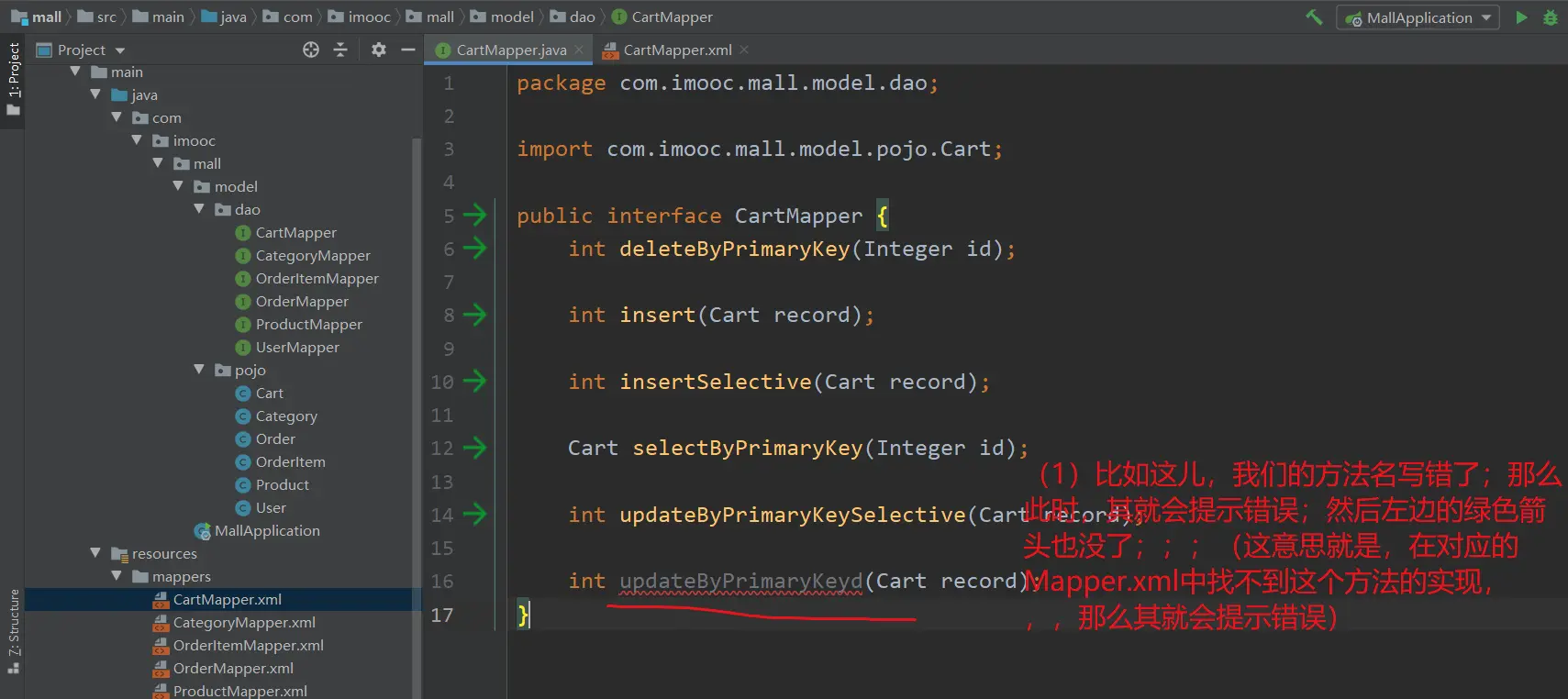 我们在【SpringBoot电商项目开发所需工具IDEA插件】中安装了【Free Mybatis Plugin】插件;这个插件的作用就是:方便我们在Mapper接口和Mapper.xml之间跳转,同时也可以帮助识别Mapper.xml中的错误;