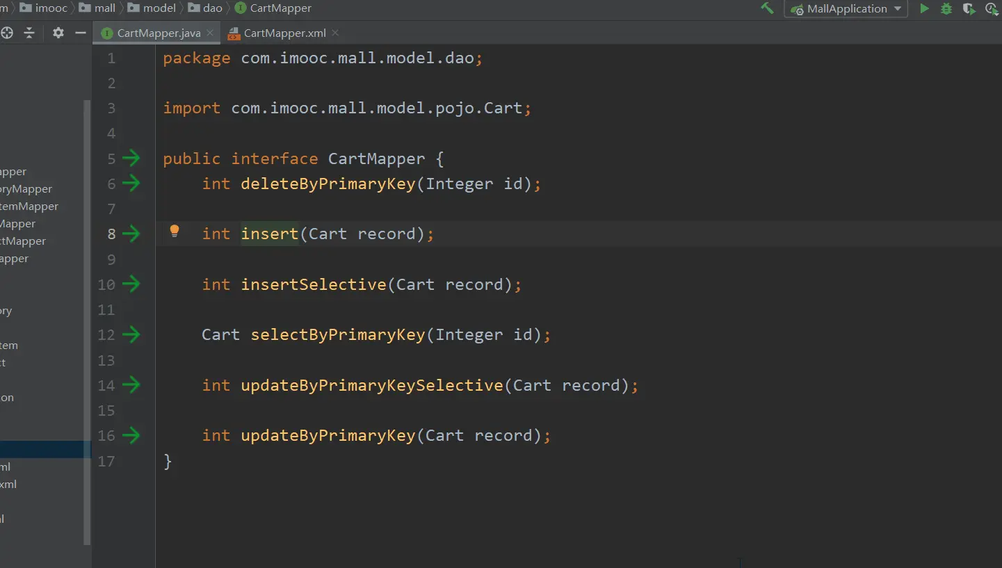 作用1: 这儿有绿色的三角:可以很好的在Mapper接口和Mapper.xml之间来回跳转: