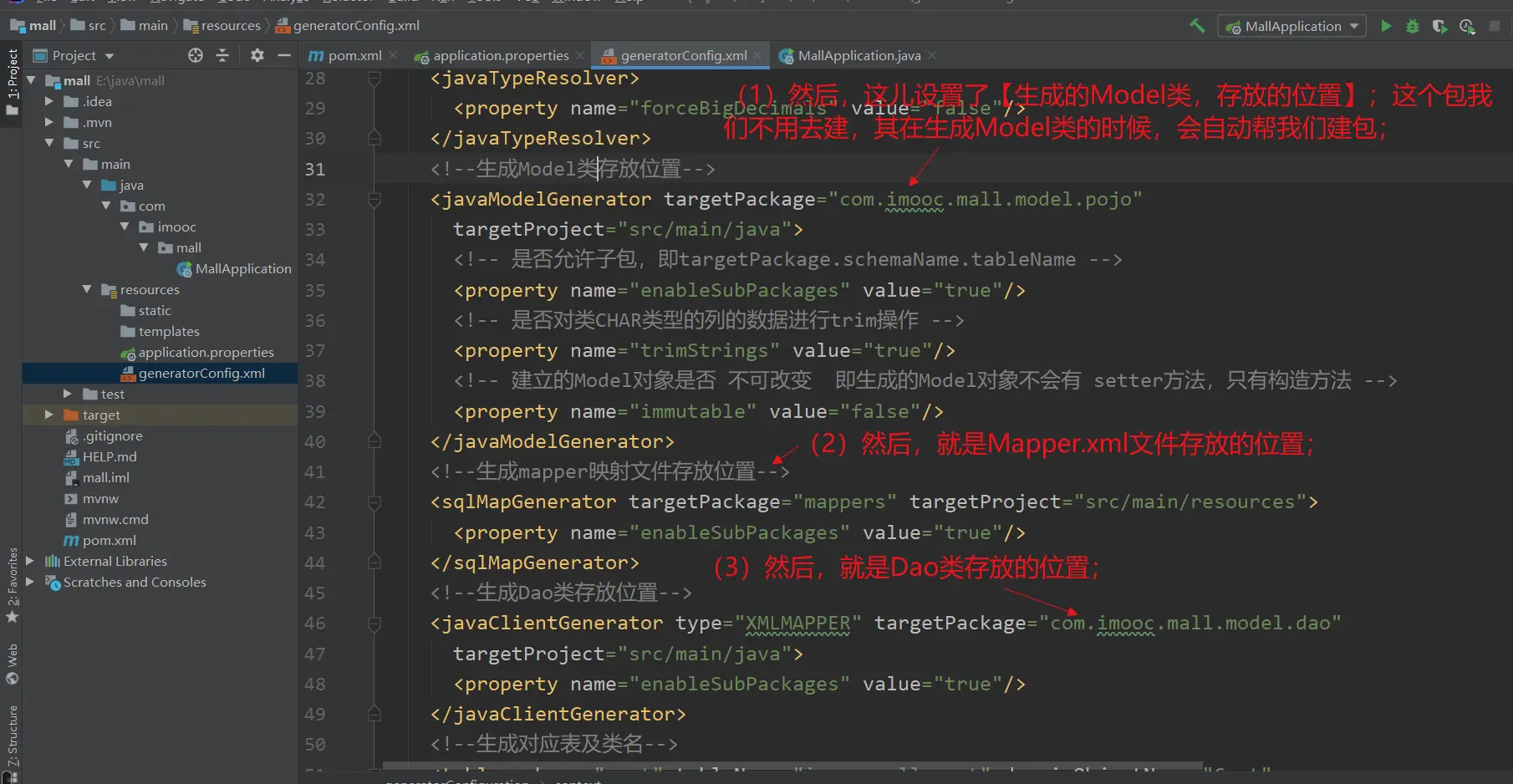 <javaModelGenerator targetPackage="com.imooc.mall.model.pojo"