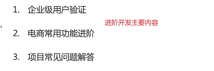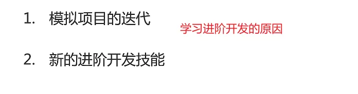 主要有两点原因,第一点原因是因为在实际的开发中,其实项目是不断迭代,不断演进的,我们不可能在最开始的时候呢就把这个电商的所有的功能,都给开发出来,那样不但浪费而且也可能是不满足于业务的需要,所以我们的项目呢,实际上是功能在不断的发展,我们就是在模拟这样的场景,看一看在原有的基础上,如果有新的功能要加进来,应该怎么去开发?那么第二个点呢是在于我们在工作中是一定要不断学习,不断掌握新知识的,这样的话,那老板才能看到我们的优秀,才能突出我们的价值,尤其是你做了这个项目,迭代项目升级的话,也会成为面试官眼中的加分项,所以这就是这两点,我们需要讲解电商进阶开发的主要原因。