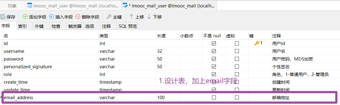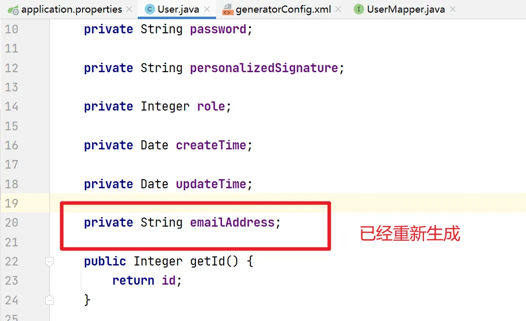 给我们的这个 user 类加一个字段,看到我们现在 user 类在这里面的是没有email字段的,因为我们之前的没有用到email,但是现在我们需要eamil,所以呢,需要给它增加这个字段,首先呢,就来到我们这个mybatis的一个配置类