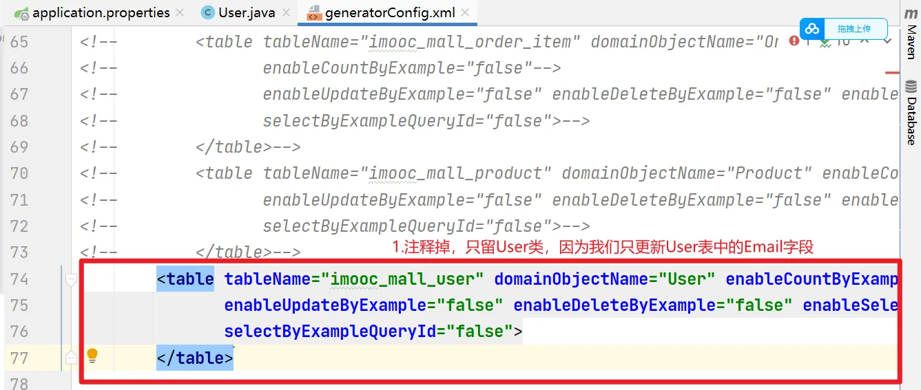因为我们前面的generatorConfig.xml文件里只留下User表,其余都注释掉啦,所以不会在其他mapper和xml文件重新生成,我们只需要管我们的user表即可。