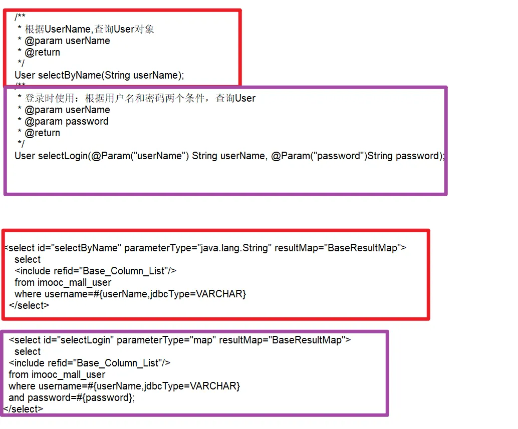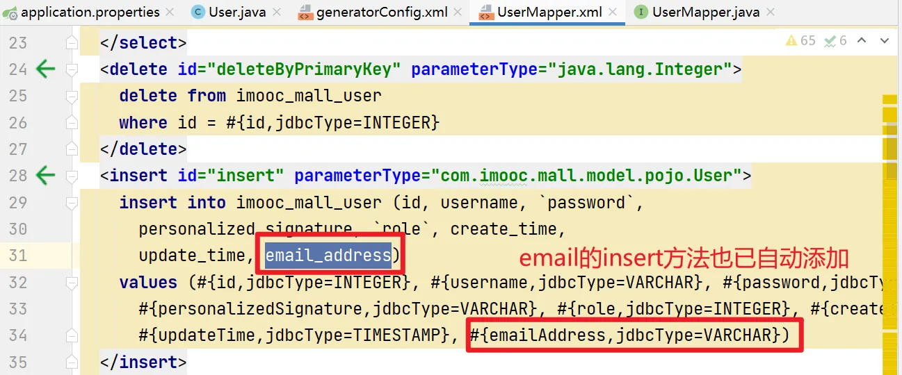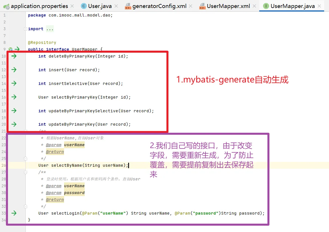 注意: 那这个时候我跟小伙伴介绍一下,当你有某个字段有更改的时候,你要去注意一些事情,首先来到这个UserMapper, 前面的这是自动生成的,但是后面这两个呢是自己写的,那这个时候如果你不去提前把这个代码给复制出来话,你会发现了,过一会儿,也就是我们重新去生成,你会发现相关的这个方法会被覆盖掉,为了避免这个情况,我们需要提前复制出去,相当于是找地方把它给保存起来。