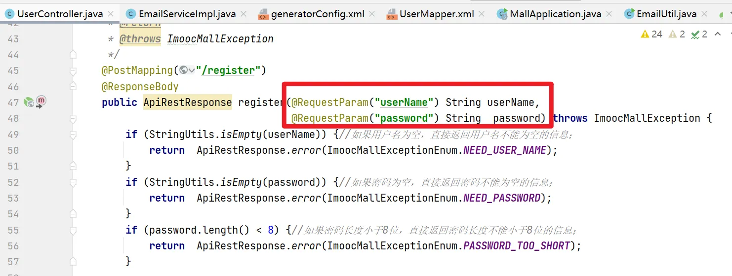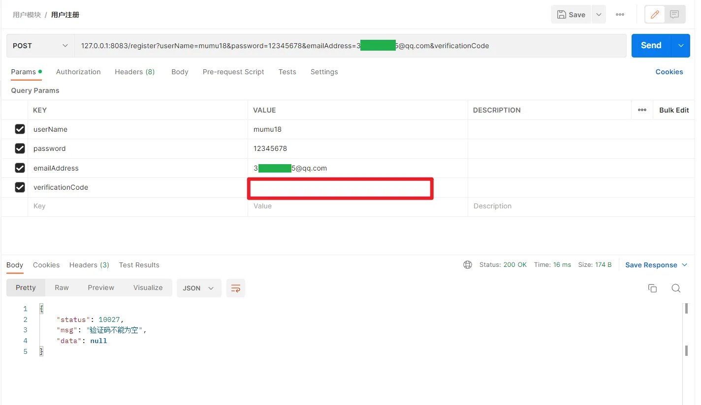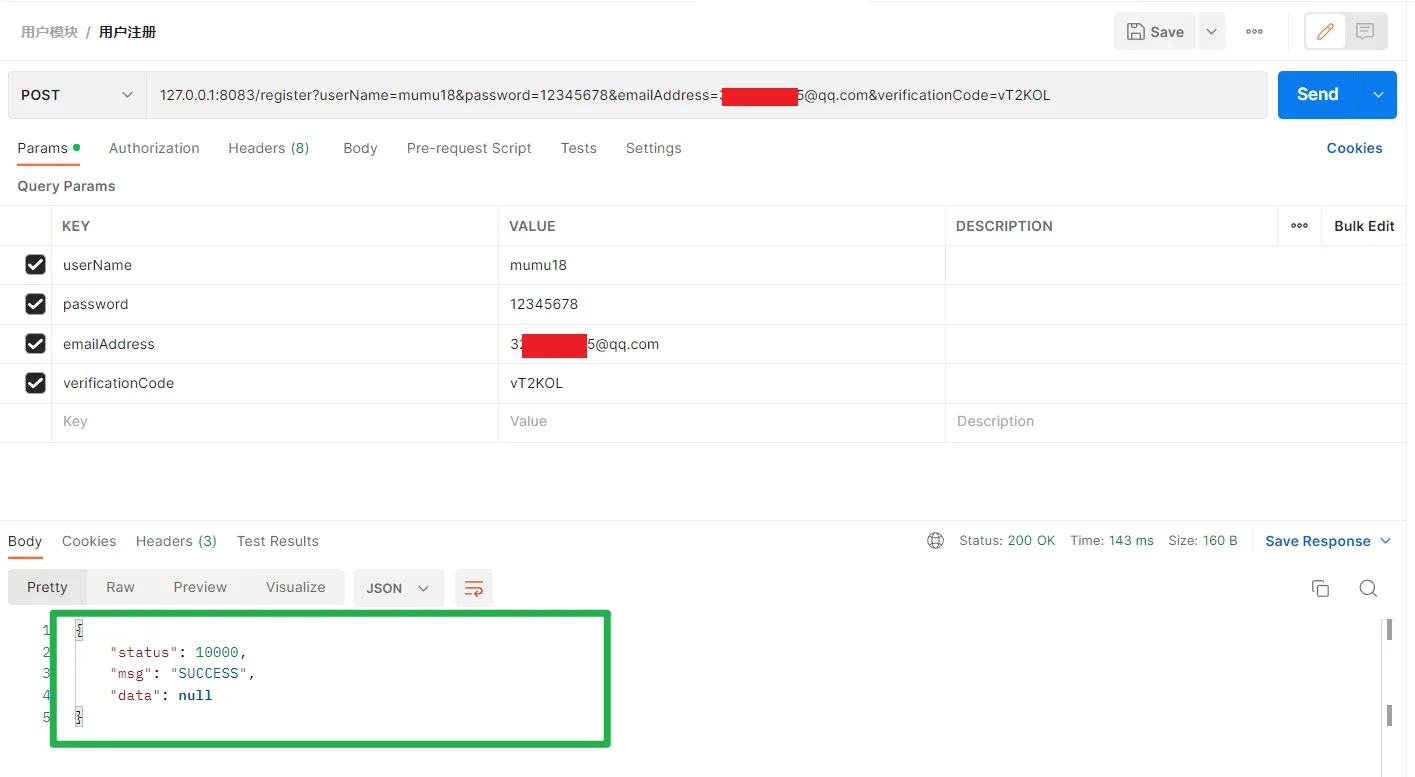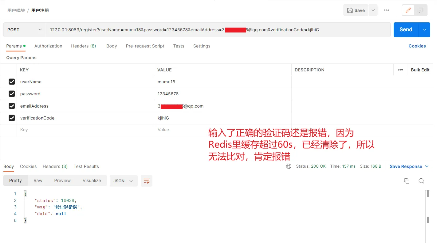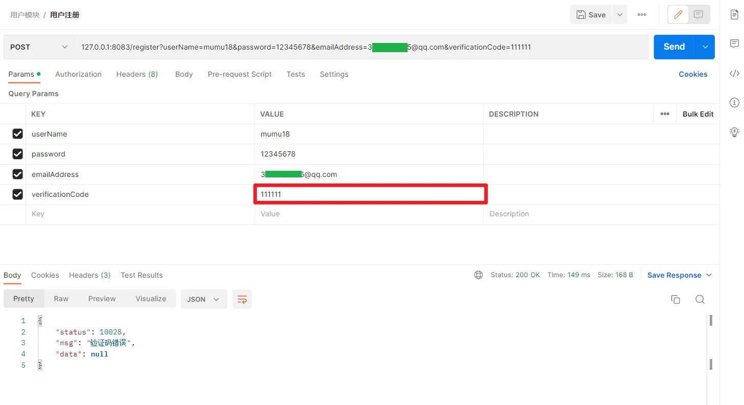 我们的注册接口参数只有用户名和密码,显然不符合要求,还需要传入邮箱地址和邮箱验证码