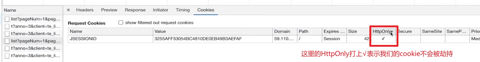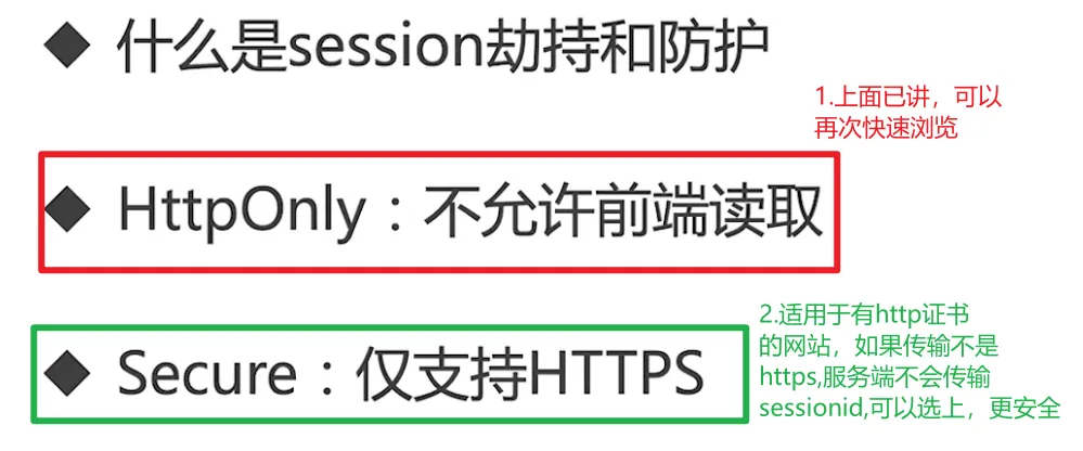 HttpOnly: 服务端告诉前端这个东西独一无二,是很重要的,不允许前端代码读取,而浏览器这里生效以后,之允许浏览器读取,就会对其保护起来,防止被前端劫持