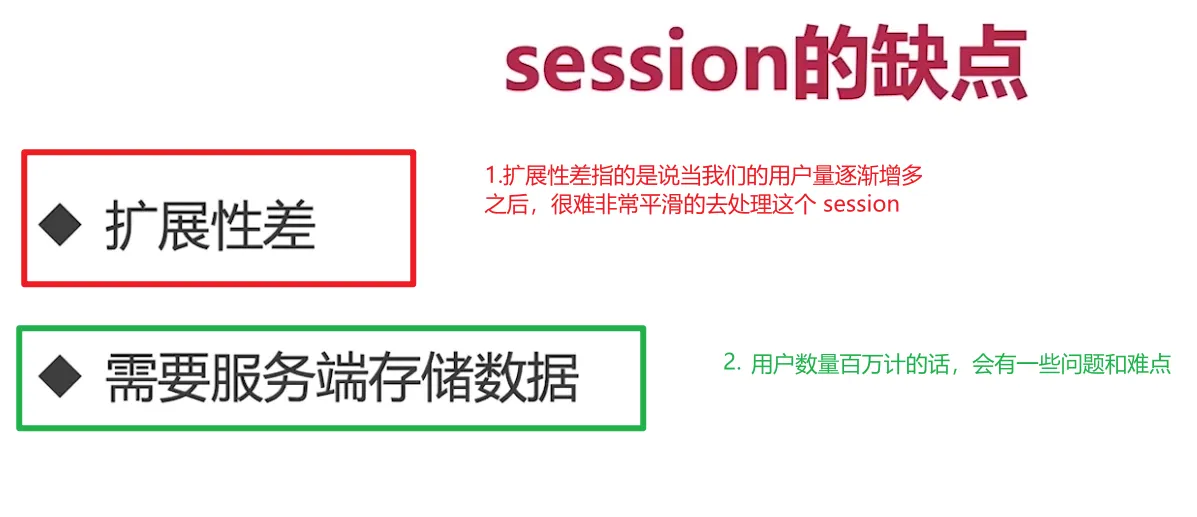 第一个是扩展性差。扩展性差指的是说当我们的用户量逐渐增多之后,很难非常平滑的去处理这个 session,因为假设我们把session保存在内存中啊。一旦你的服务是分布式的,有多台机器的话,你就会涉及到一个同步和复制的问题,第二个缺点呢?主要是需要服务端去存储数据,因为假设我们的用户量特别大数100万的话,那么你会发现这个用户数据的存储啊也不是一件简单的事情,不管你是存在内存中还是 redis 中,或者是数据库中的?那都会有对应的一些问题和难点,所以呢,从下一个小节开始我们就来学习追 Jwt, 很好的克服了session的这两个缺点。