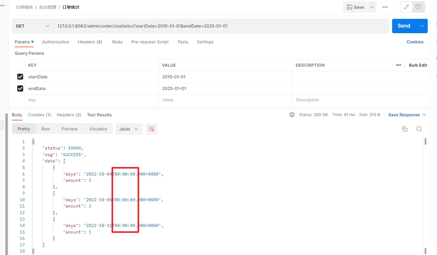 List<OrderStatisticsVO> statistics = orderService.statistics(startDate, endDate);