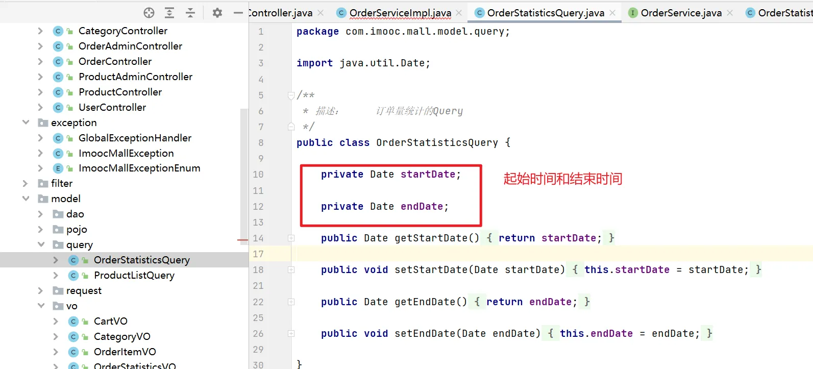 List<OrderStatisticsVO> statistics(Date startDate, Date endDate);4.OrderServiceImpl实现方法