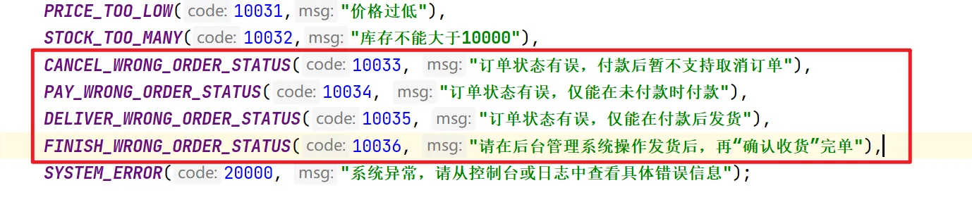 WRONG_ORDER_STATUS(10022,"当前订单状态,不允许取消")WRONG_ORDER_STATUS改为更具体的CANCEL_WRONG_ORDER_STATUS、PAY_WRONG_ORDER_STATUS、DELIVER_WRONG_ORDER_STATUS、FINISH_WRONG_ORDER_STATUS从而更具体的描述订单为什么无法取消,在取消订单、支付订单、派送订单以及订单完成时都有不同原因,需要具体化,否则用户一头雾水