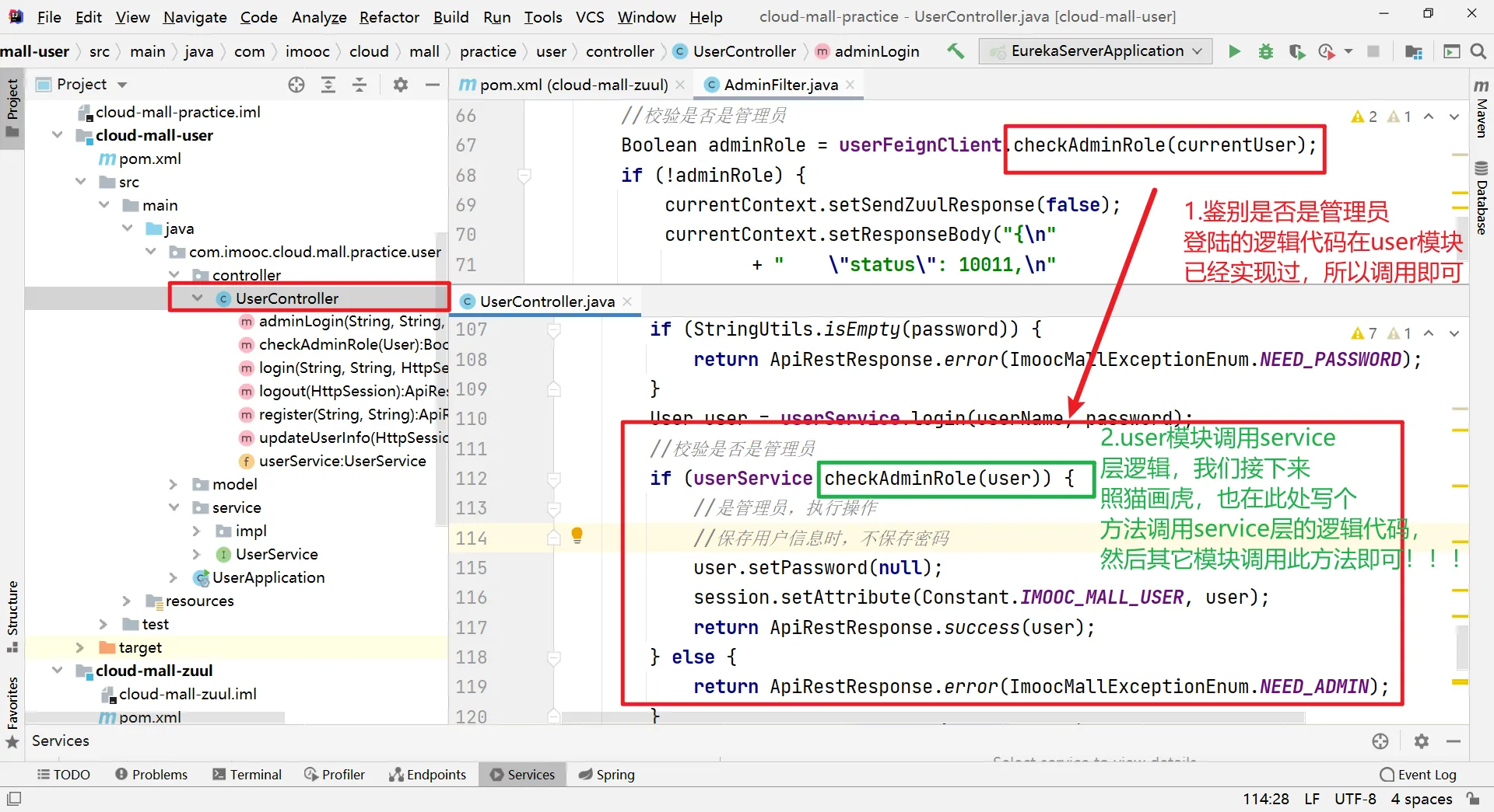 UserController层编写调用service验证是否管理员登陆的方法;