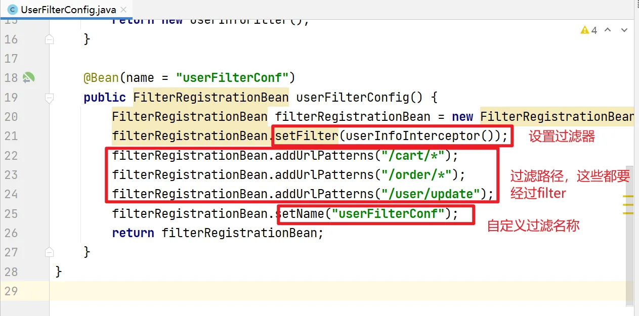 public FilterRegistrationBean userFilterConfig() {