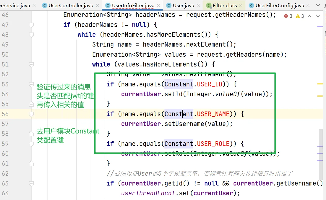 //必须保证User的3个字段都完整,否则意味着网关传递信息时出错了