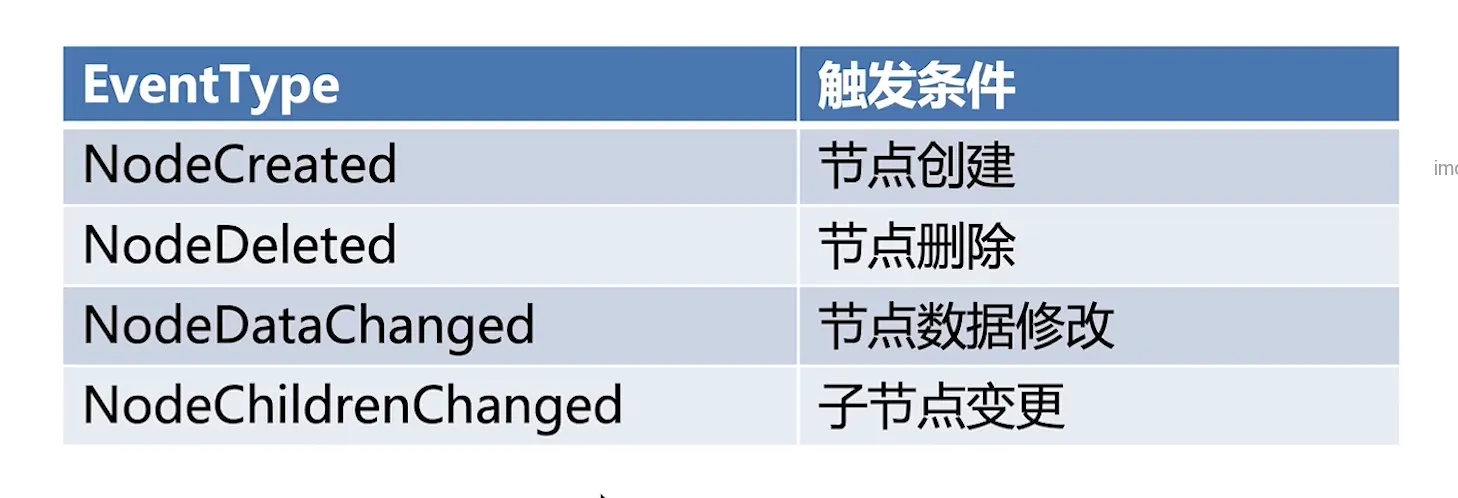 触发事件种类很多,如:节点创建,节点删除,节点改变,子节点改变等。