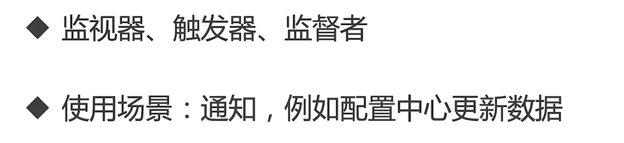 ZooKeeper中,引入了Watcher机制来实现这种分布式的通知功能。ZooKeeper允许客户端向服务端注册一个Watcher监听,当服务端的一些事件触发了这个Watcher,那么就会向指定客户端发送一个事件通知来实现分布式的通知功能。