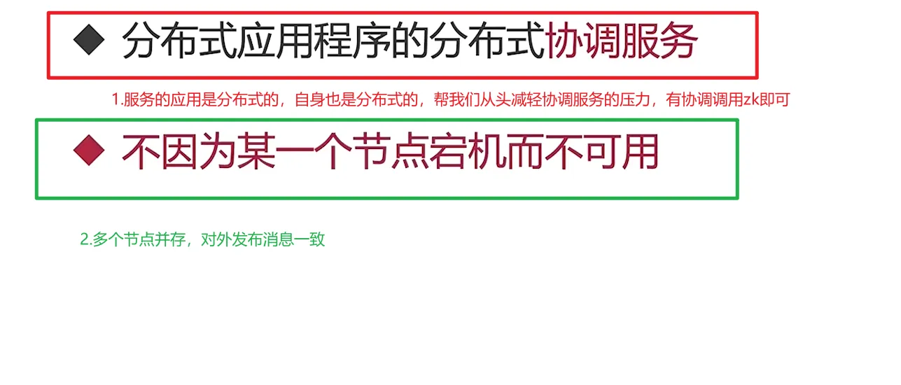 它是一个单点的系统,单点的系统永远都是不可靠的,我们系统一旦大了之后呢,一定要尽量尽量的去避免单点,这是因为啊,机器在运行的时候呢,会有各种各样的问题,甚至说他们如果运行没有问题,甚至网络甚至电力,这些都有可能会成为瓶颈,成为一个不可控的因素,所以有的时候我们要想保证系统的稳定,那么单机呢是必须要避免的,如果发生故障,你很难继续提供稳定的服务,所以我们才需要呢这样的一个这个 ZK 呀?它是什么呢?就是说它是不但解决了我们单点的这个问题,那解决单点问题之后,你自然就变得高可用了。其次呢,它还有一个重要的特点就是可以对外保持数据一致。这个就是我们需要做 Zookeeper 的原因,我们需要一个能够对外提供数据一致的这样的一个组件同时能让它保证高可用。