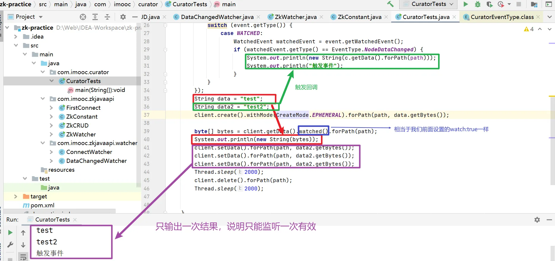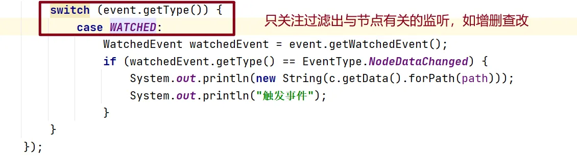 }**注意: if (watchedEvent.getType() == EventType.NodeDataChanged)语句,创建时是不会触发watch的! **