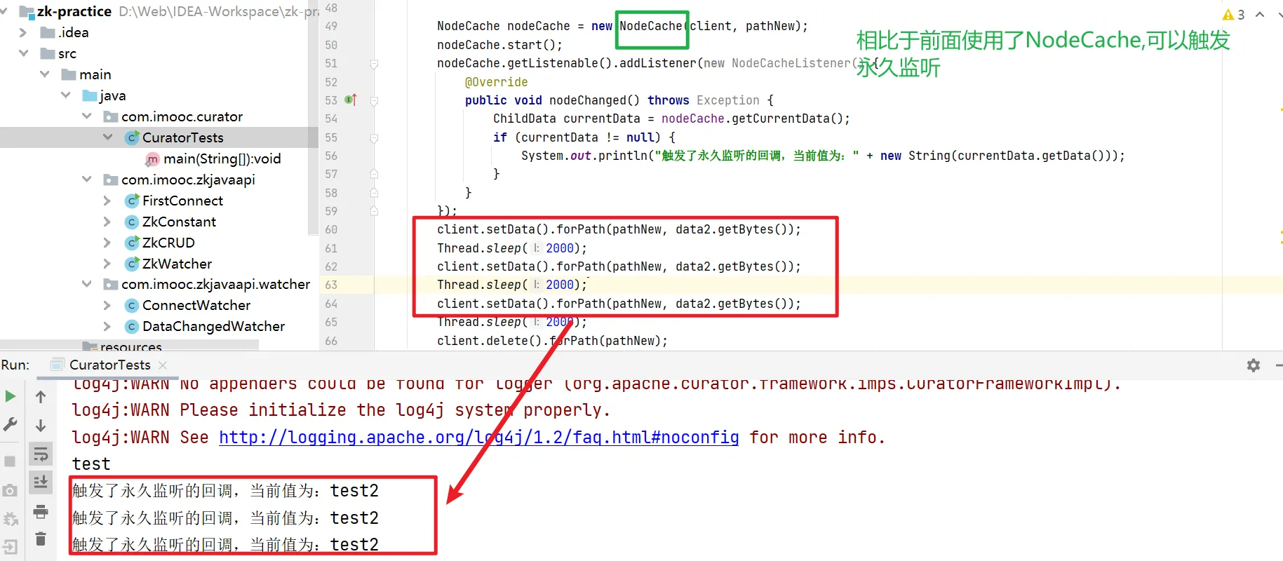 System.out.println("触发了永久监听的回调,当前值为:" + new String(currentData.getData()));