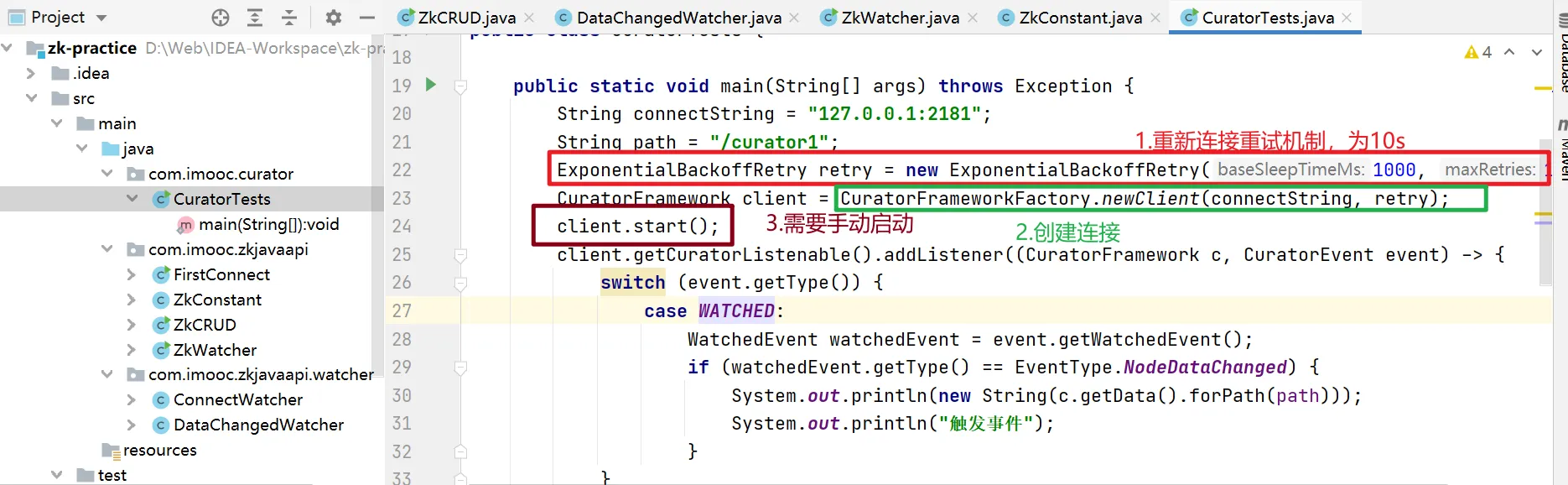 会话超时异常时,不支持自动重连,需要手动重新连接,编程繁琐 watcher 是一次性的,注册一次后会失效 节点数据是二进制,对象数据都需要转换为二进制保存 前面的data.getBytes()就是把字符串转为二进制。。。 不支持递归创建节点,需要先创建父节点再创建子节点 不支持递归删除节点,需要先删除子节点再删除父节点 原生zookeeper客户端和服务器端会话的建立是一个异步的过程,也就是说在程序中,我们程序方法在处理完客户端初始化后,立即返回(程序往下执行代码,这样,大多数情况下我们并没有真正构建好一个可用会话,在会话的声明周期处于”CONNECTED”时才算真正建立完毕,所以我们需要使用多线程中的一个工具类CountDownLatch来控制,真正的连接上zk客户端后,才可以继续操作zNode节点)