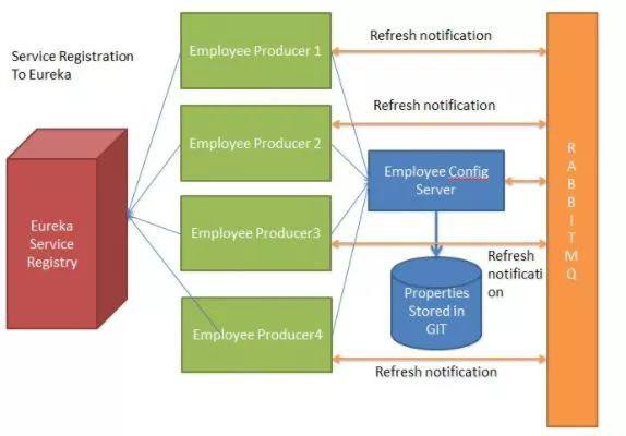 Spring Cloud Bus 提供了跨多个实例刷新配置的功能。因此, 在上面的示例中, 如果我们刷新 Employee Producer1, 则会自动刷新所有其他必需的模块。如果我们有多个微服务启动并运行, 这特别有用。这是通过将所有微服务连接到单个消息代理来实现的。无论何时刷新实例, 此事件都会订阅到侦听此代理的所有微服务,并且它们也会刷新。可以通过使用端点/总线/刷新来实现对任何单个实例的 刷新。