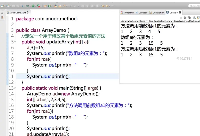 数组a1指向的是数组第一个元素的内存地址,当调用updateArray()方法时,程序将a1的值复制给了该方法的形参变量a,即此时a变量的值也是数组第一个元素的内存地址,即对a所对应变量的更改也是对a1所应对应变量的更改。(其他引用数据类型,如对象也是这种情况)