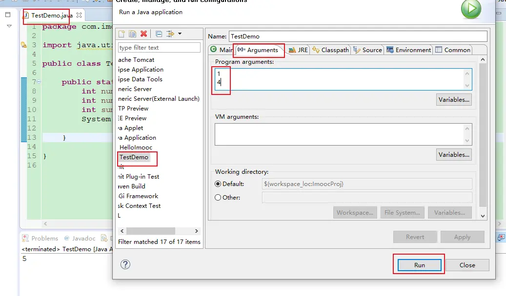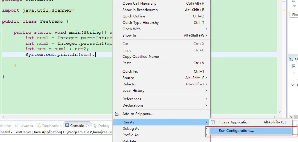 如以下程序,分别演示【直接运行】和【通过eclipse运行】,这两种方式给main方法传递参数