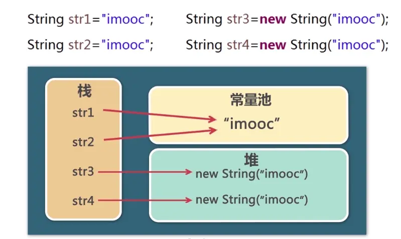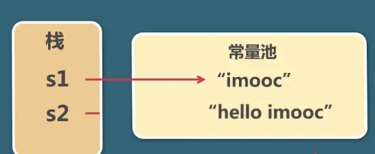 String s1 = "imooc"; // 在常量池中生成一个"imooc"字符串,在栈中有一个s1引用指向这个字符串