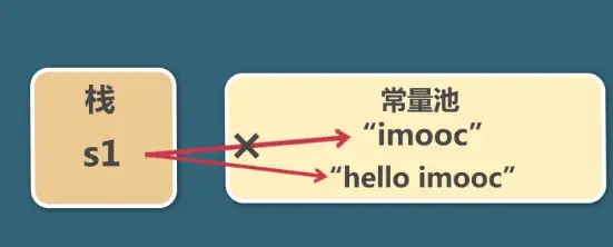 s1 = "hello,"+s1; // 在常量池中生成了一个"hello,imooc"字符串,然后,s1改指向"hello,imooc"这个字符串了;