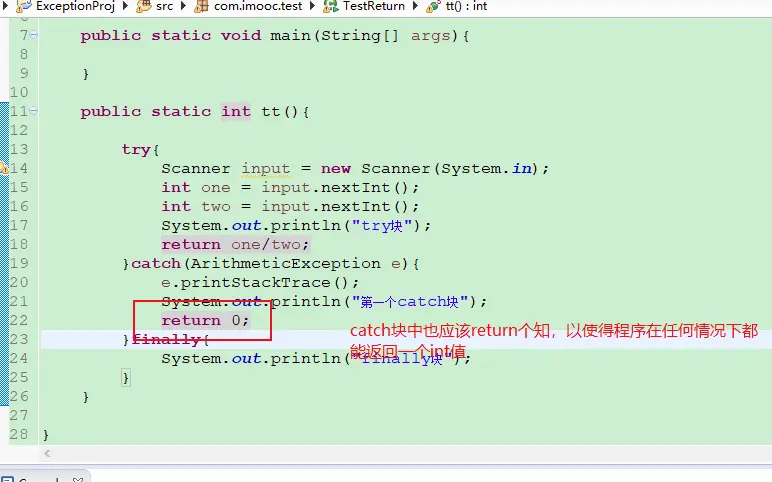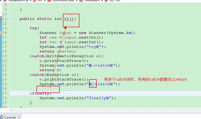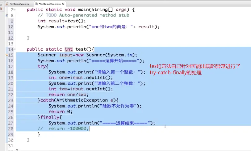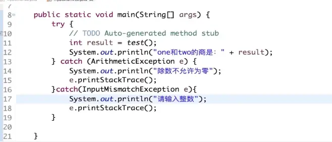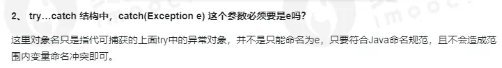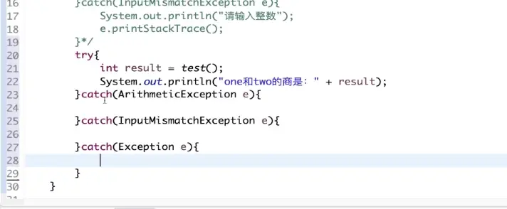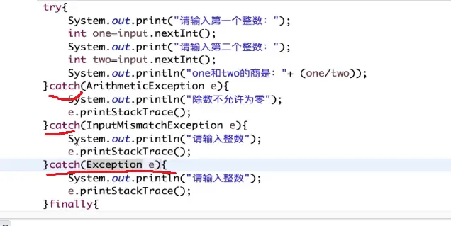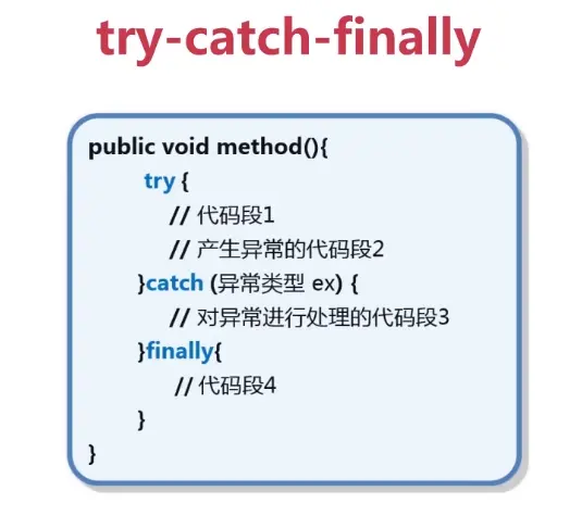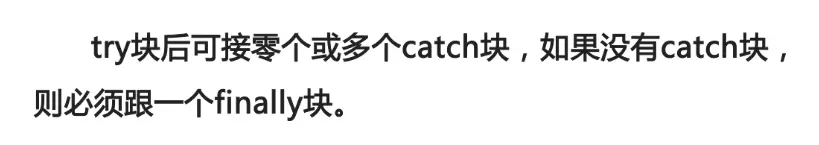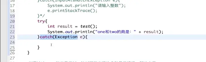}catch(Exception e){ // try块中产生的异常会被抛出,抛出的异常会被catch块中的Exception对象捕获,