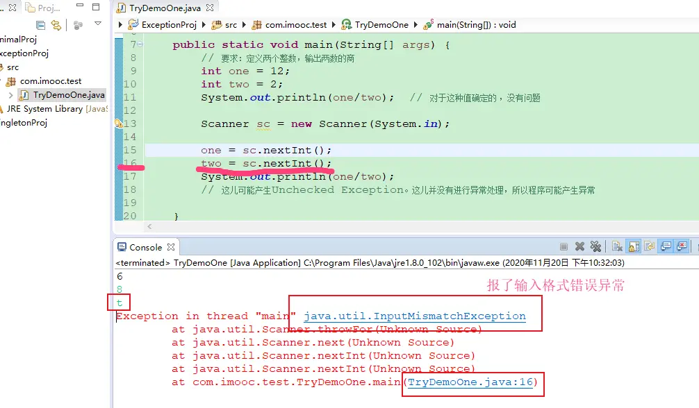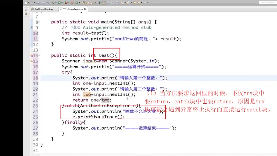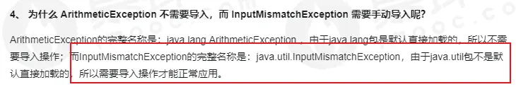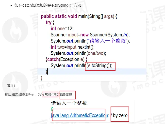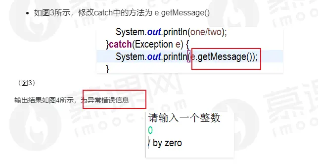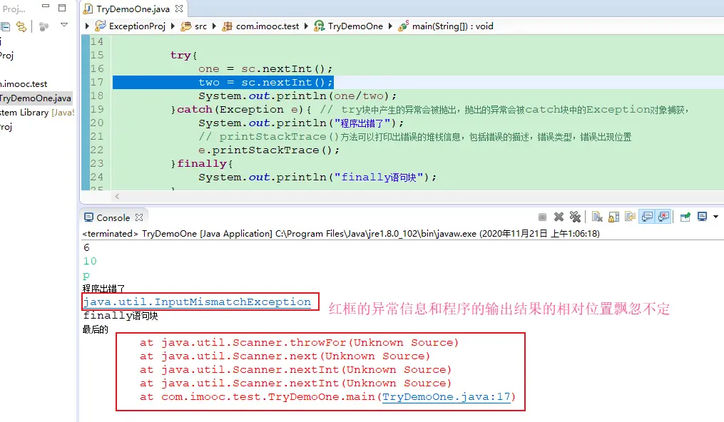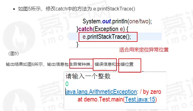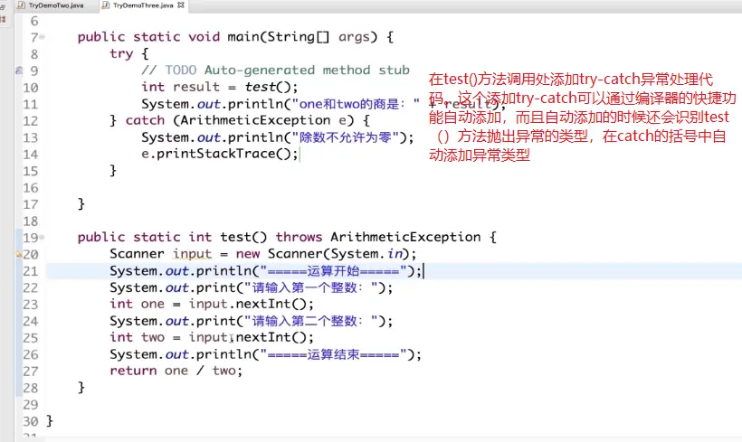 (2)当异常被catch块捕获后,程序便不会输出红色的错误信息了,但我们常常通过e.printStaceTrace()方法去主动打印错误信息;主动打印的错误信息有助于我们查找错误位置和原因。