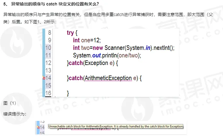 (4)当try块抛出一个异常对象的时候,这些catch块有点依次比对的感觉,直到匹配到正确的异常类型;