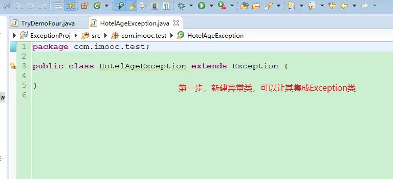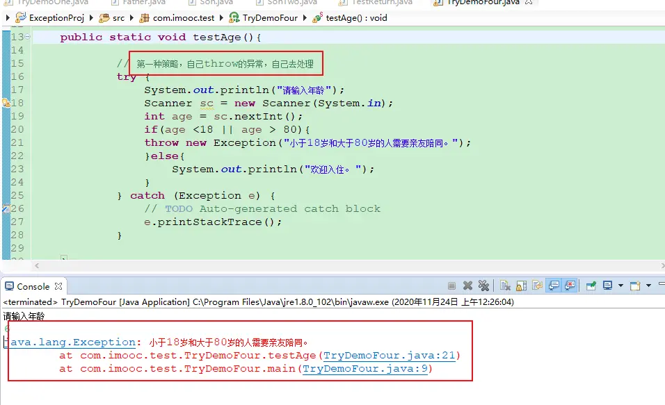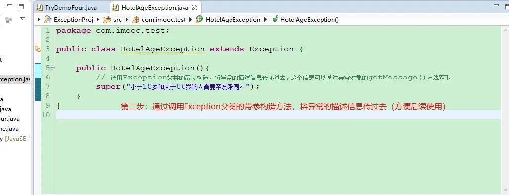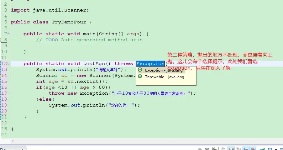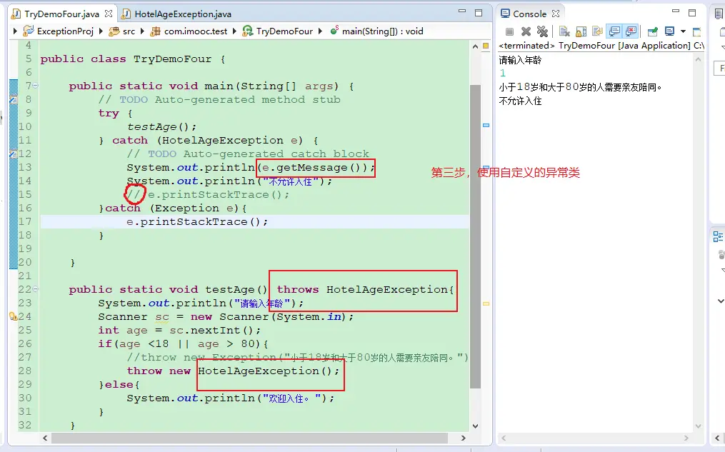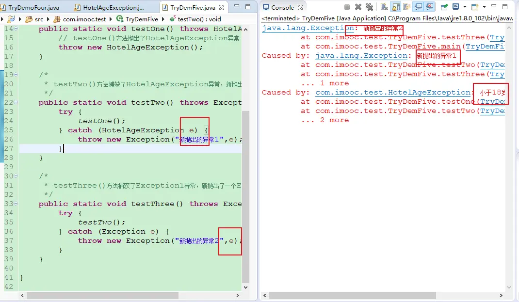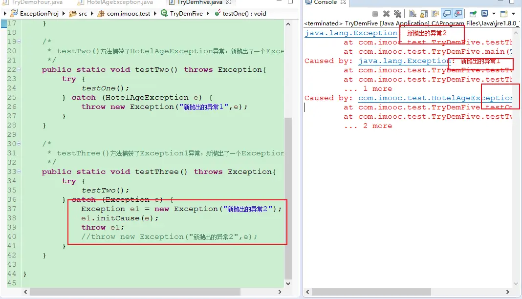 * testTwo()方法捕获了HotelAgeException异常,新抛出了一个Exception异常1
