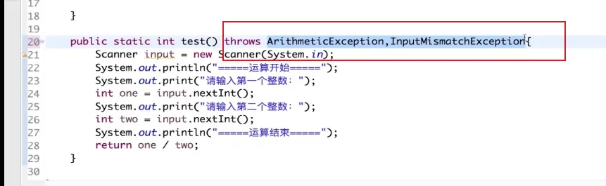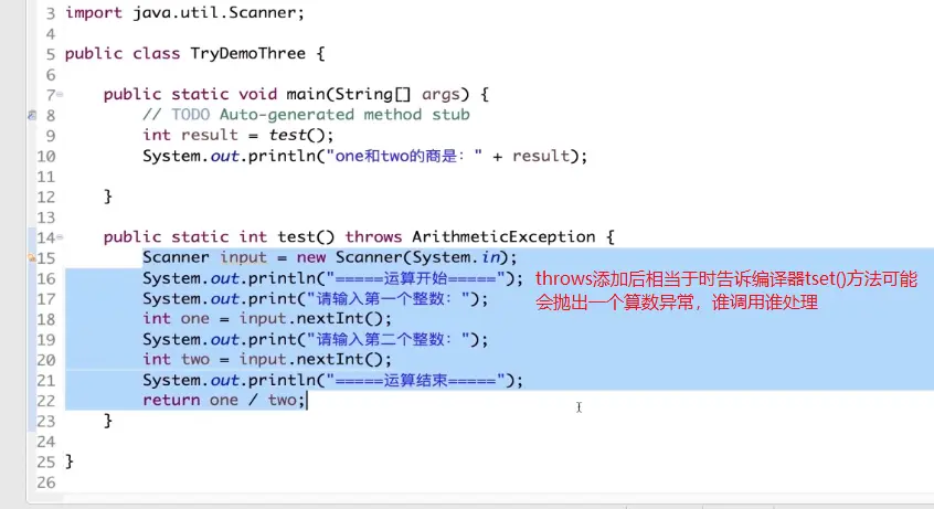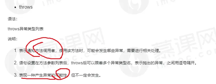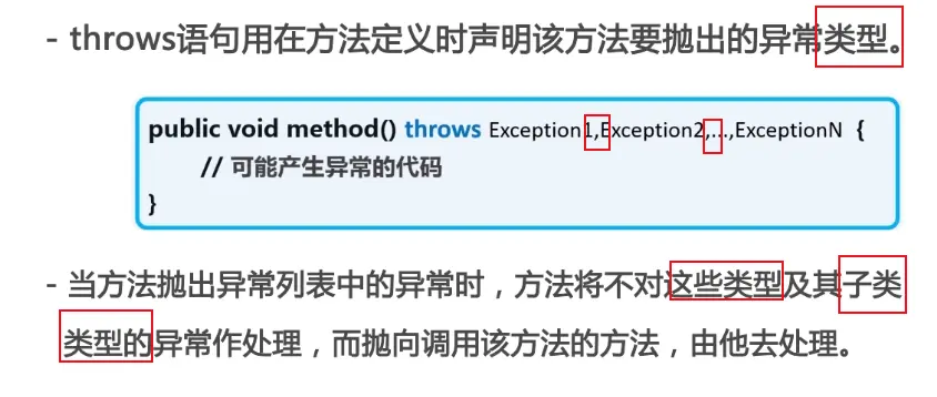 当一个方法中可能会出现异常,但是这个方法自身并不想或者没有能力去处理这些异常的时候,那么可以在该方法的声明处通过throws关键字来声明抛出这个异常,谁接到了这个异常就由谁来处理这个异常(即,谁调用了这个方法谁就会来处理这个异常)