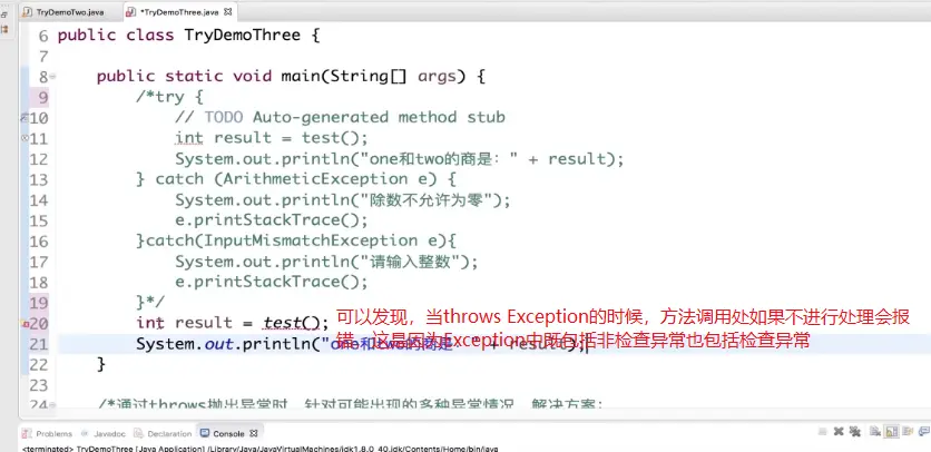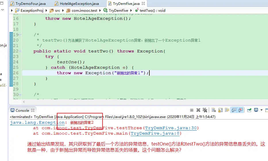 * testThree()方法捕获了Exception1异常,新抛出了一个Exception异常2