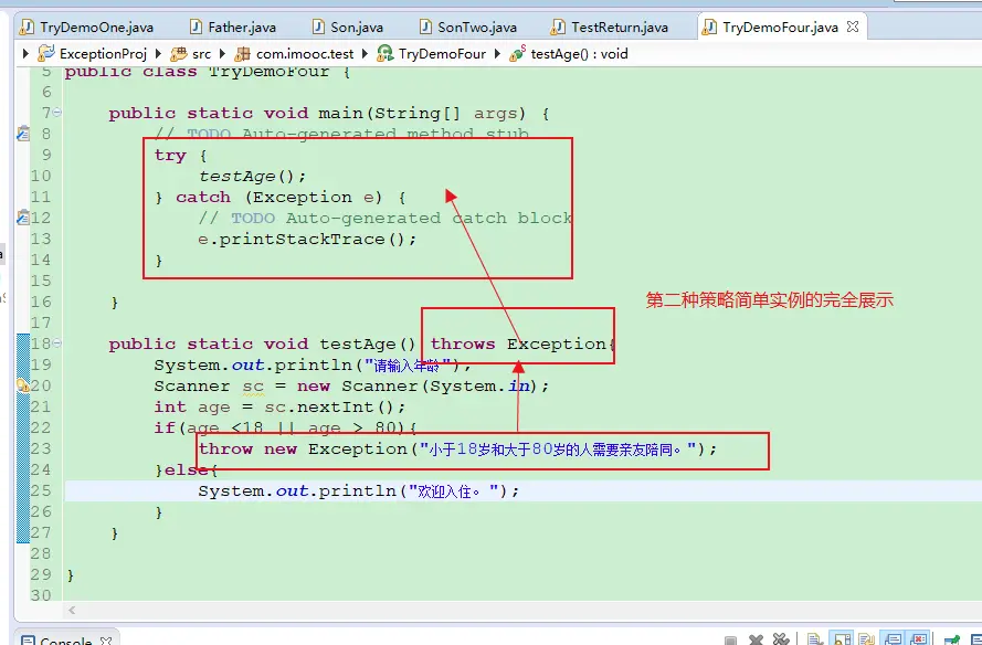 (2)第二种策略,自己抛出的异常,自己不处理接着向上抛