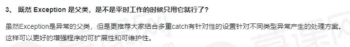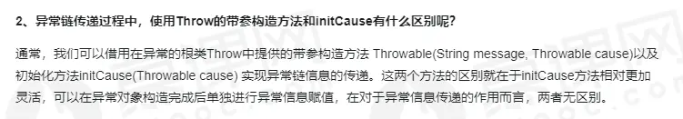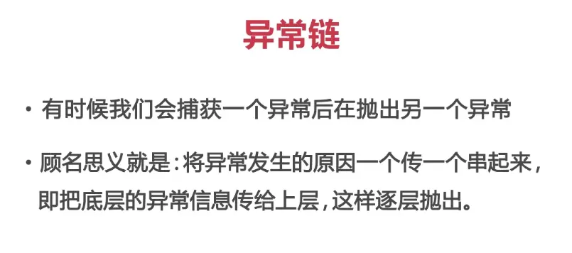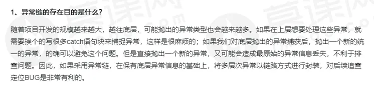 1.这的意思是,对于异常链来说,一个方法抛出异常后,应该在下一个环节就把上个环节抛过来的异常捕获了,不要都挤压到最后一个环节再统一捕获。但这个过程又可能会丢失异常信息,所以需要异常链技术,在保证不丢失异常信息的情况下,很好的完成异常的捕获。