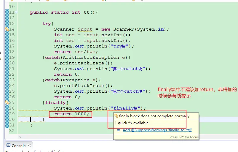 finally块:无论是否发生异常,其都会执行;(经过实测发现,当try块中抛出了异常,而且没有catch块能够捕获这个类型的异常的时候,finally块依旧能够执行)