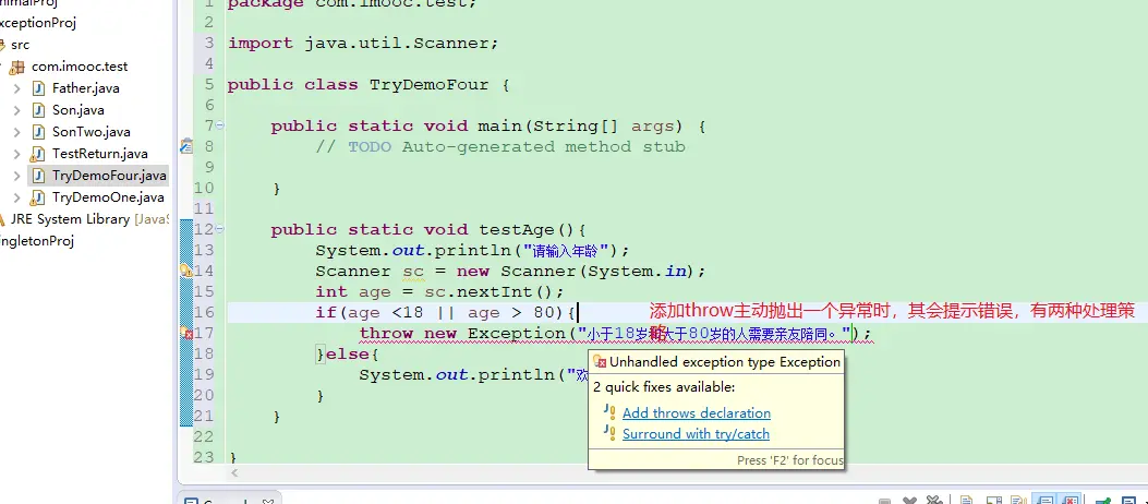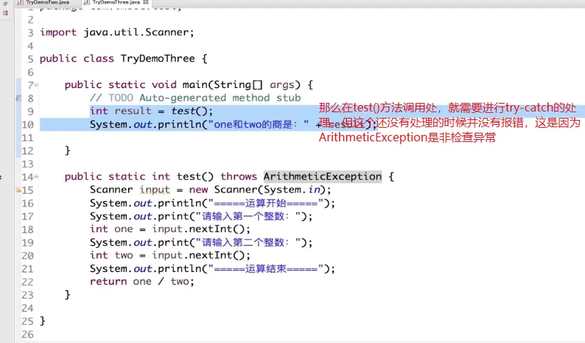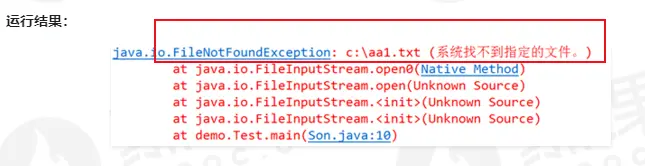 方法调用处,给了错误提示,要么对这个异常进行捕获,要么继续向上抛(这儿特殊,是main方法,如果main方法还不捕获异常继续向上抛就是抛给虚拟机了,将由系统进行异常处理)