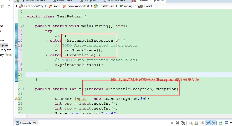 (3)一般我们不能保证列举写出所有可能出现的异常的情况,所以在最后,习惯用Exception这个异常的父类兜底;且兜底的这个Exception必须在最后;