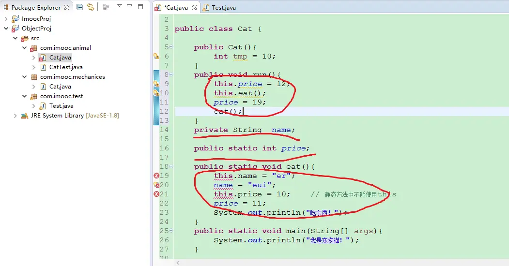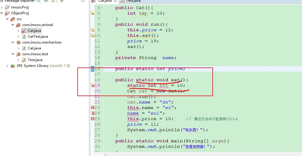 (3)在普通成员方法中:可以访问同类中的静态方法;可以访问同类中的静态属性;因为静态成员属于类,属于类的所有对象共享的,所以类的每一个具体对象都可以访问静态成员(普通成员方法是和类对象相生相伴的),所以在下面的例子中,this.eat()是可以的(但不推荐这样做,因为static修饰的东西,是更希望用户直接用类名.eat()的方式调用的)