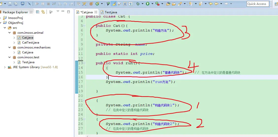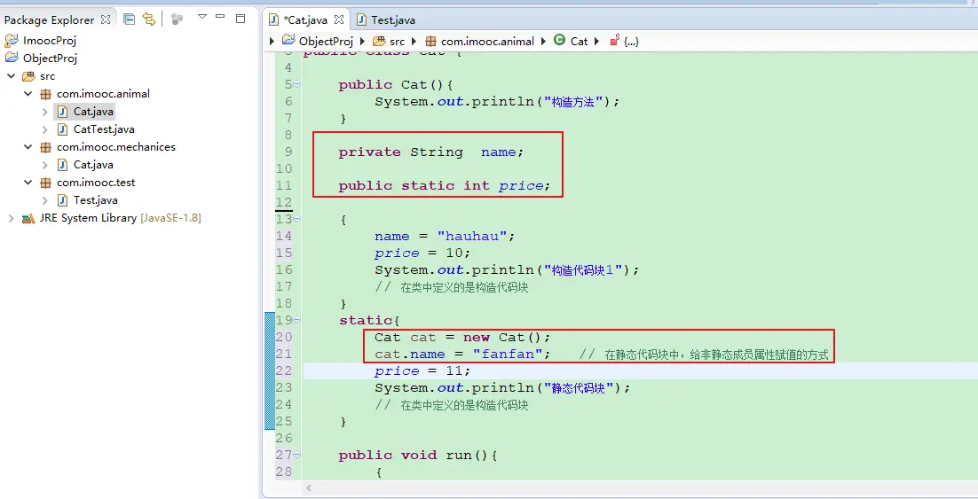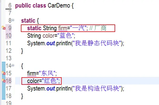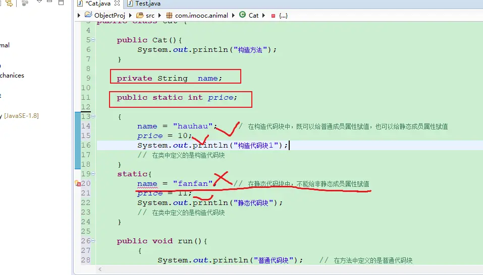 注(2):在非静态代码块,可以给普通成员属性和静态成员属性赋值;在静态代码块中,只能给静态成员属性赋值,不能直接给普通成员属性赋值;