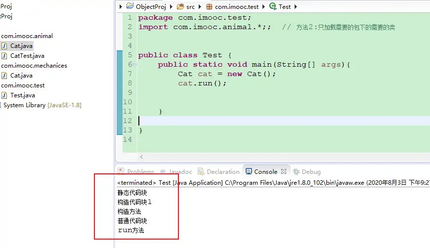 注:import com.imooc.*;的意思是只能访问imooc包下所有的类,访问不了imooc包中animal包和mechanices包里面的类!