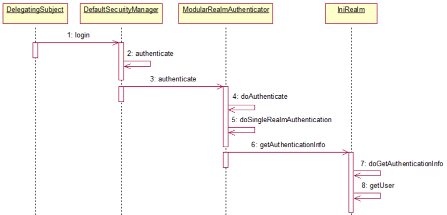 Step 1: 应用程序代码调用 Subject.login 方法,传递创建好的包含终端用户的 Principals(身份) 和 Credentials(凭证) 的 AuthenticationToken 实例