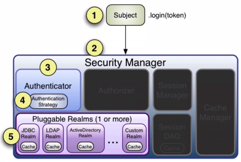 - 提交 Principals(身份) 和 Credentials(凭证) 进行身份验证;